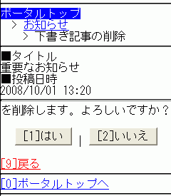 1.[[1]はい]ボタンをクリックすると記事が削除され、ブログ管理トップ画面が表示されます。