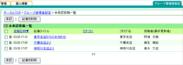 投稿前の管理者の承認を「必要」と設定した場合、管理者は投稿内容を確認後、承認を行い、記事の表示を許可するかどうかの判断ができます。