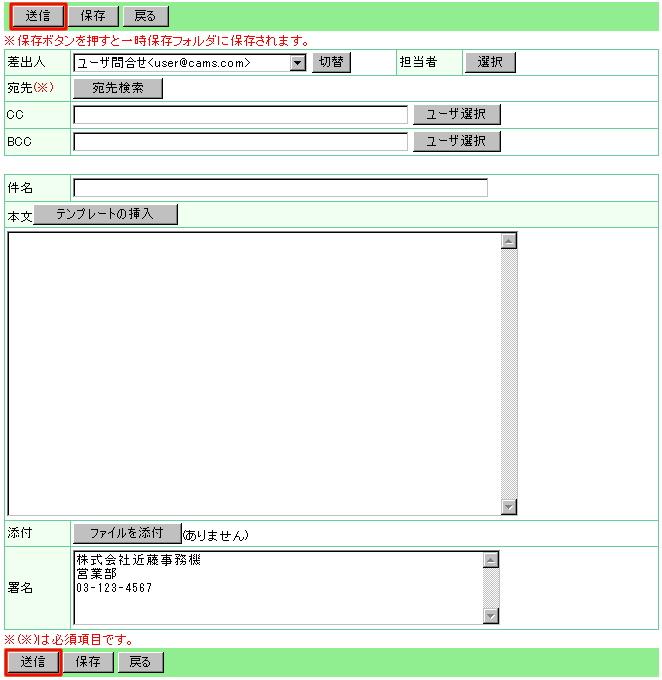 メールの内容を一時保存したい場合は、[保存]ボタンをクリックしてください。 |