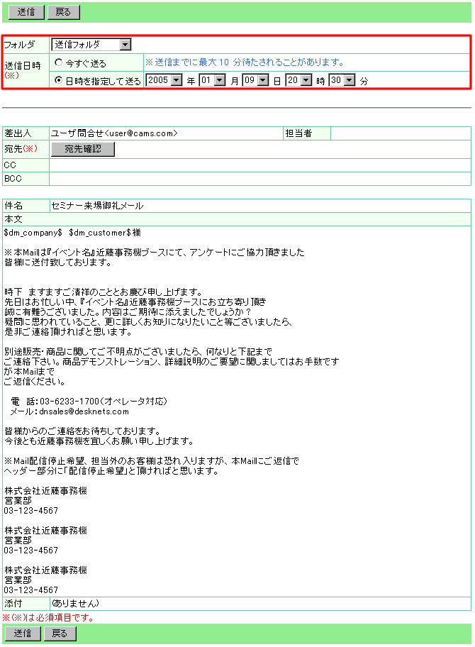 | ダイレクトメールの送信を行った後の格納フォルダの選択と、ダイレクトメールを送信する日時を入力してください。 |