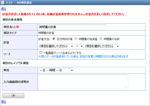 時間量の計算の設定画面には、DB項目一覧から遷移してください。