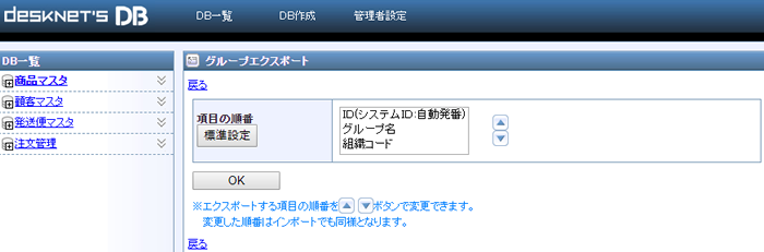 項目の順番にて「標準設定」のボタンを押下し、初期状態の項目順にします。「OK」ボタンを押下してグループのエクスポートを実行します。