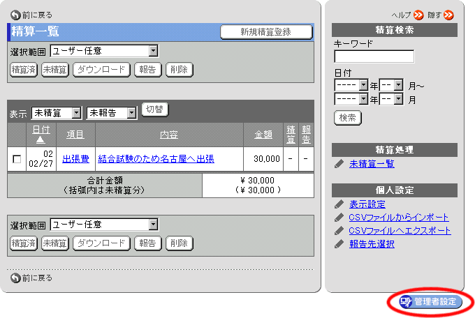 精算一覧画面の右下にある「管理者設定」ボタンを押します。