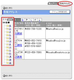 全員で共有されているアドレス帳です。 「あ〜わ」「英語」「数字」「記号」のリンクを押してアドレス一覧を切り替えることができます。 ※50音順はアドレス登録・変更で設定した、氏名のふりがなと勤務先会社名のふりがなを対象としています。