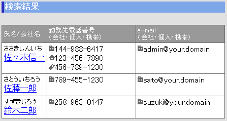 入力した検索条件に該当するアドレスが一覧に表示されます。
