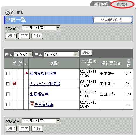 作成した申請について、[表示]欄と[表題]欄で選択されている条件に該当する申請の一覧が表示されます。([表示]欄で"すべて"を選択した場合、"下書き"の申請は表示されません。) 一覧の[進捗]欄は、申請先に設定されている全ユーザーのうち、何人のユーザーがこの申請書を承認したかを表しています。 [選択範囲]欄のを押すと、該当する申請にアイコンが表示されます。もう一度同じ操作を行うと、フラグが解除されます。 [選択範囲]欄のを押すと、該当する申請を完了することができます。