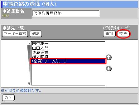 グループ名、承認のルール、否認時の戻し先を入力したら、承認グループのユーザーを選択して下さい。