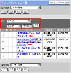 [表示]欄で選択されている条件に該当するインフォメーションが一覧表示されます。
