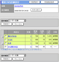 購買管理画面の”購買予約名”リンクを押すと、購買予約詳細設定画面が表示されます。 購買予約詳細設定画面では、購買予約の商品に関する情報が一覧に表示されています。 ※状態が「未取寄」の商品は、薄い黄緑色で表示されます。