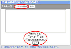 を押すと利用する設備が登録され、設備予約の登録画面の[利用設備]欄に表示されます。