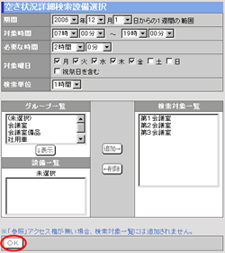 [グループ一覧]、[設備一覧]から、空き状況の検索対象となる設備を[検索対象一覧]へ追加してください。