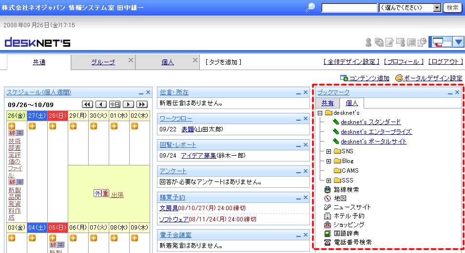 また、共有ブックマークは、トップポータル以外にもログイン画面、オプションメニューにも表示することができます。