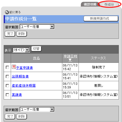 作成した申請について、[表示]欄で選択されている条件に該当する申請の一覧が表示されます。([表示]欄で"すべて"を選択した場合、"下書き"の申請は表示されません。) [選択範囲]欄のを押すと、該当する申請を完了することができます。