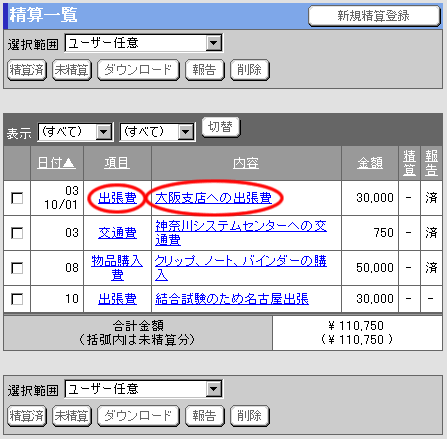 精算一覧画面の”項目”リンク又は”内容”リンクを押します。
