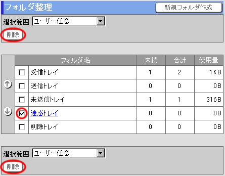 フォルダ整理画面の[選択範囲]欄より、削除したいフォルダを選択してくだい。