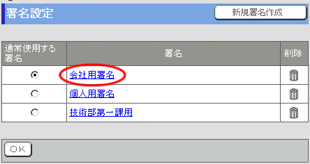 署名一覧から通常使用する署名のラジオボタンを選択します。