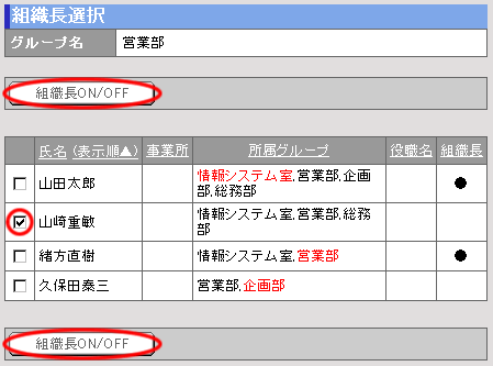 ”●”マークがついている組織長を選択して[組織長ON/OFF]ボタンを押した場合、組織長ではなくなります。