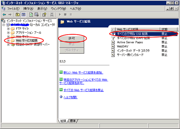 Internet Information Services 7 の初期設定では、CGI プログラムの実行は制限されており、