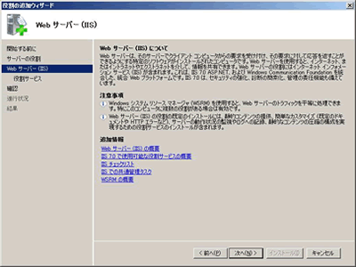 ”Webサーバー(IIS)”についての説明が表示されますので、「次へ」ボタンを押します。