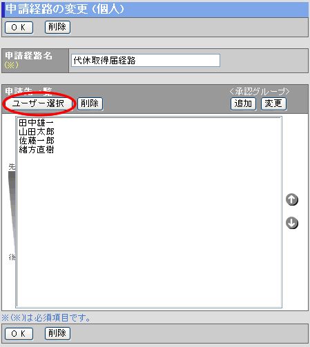 ※[削除]ボタンを押すと申請経路を削除することができます。