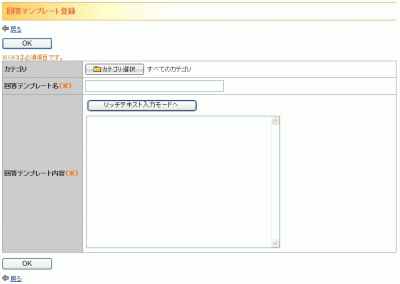回答テンプレート内容を入力してください。 [リッチテキスト入力モードへ]をクリックすると、リッチテキストでの入力ができます。 ・リッチテキスト入力モードの説明はこちら ※10000文字まで入力可能です。 ※必須項目のため回答テンプレート内容が入力されていない場合は、登録することができません。 |