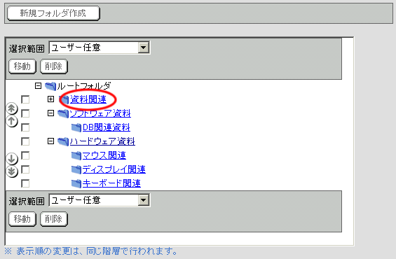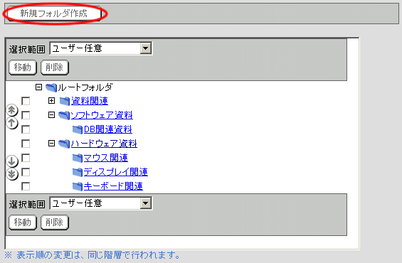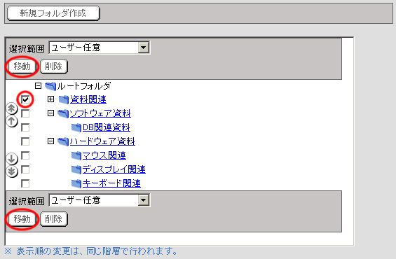 フォルダ管理一覧画面の[選択範囲]欄より移動したいフォルダを選択してください。