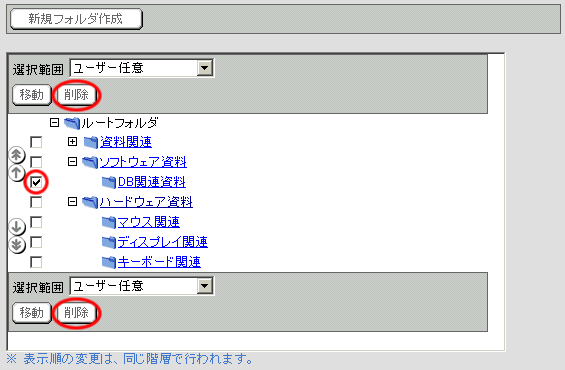 フォルダ管理一覧画面の[選択範囲]欄より削除したいフォルダを選択してください。