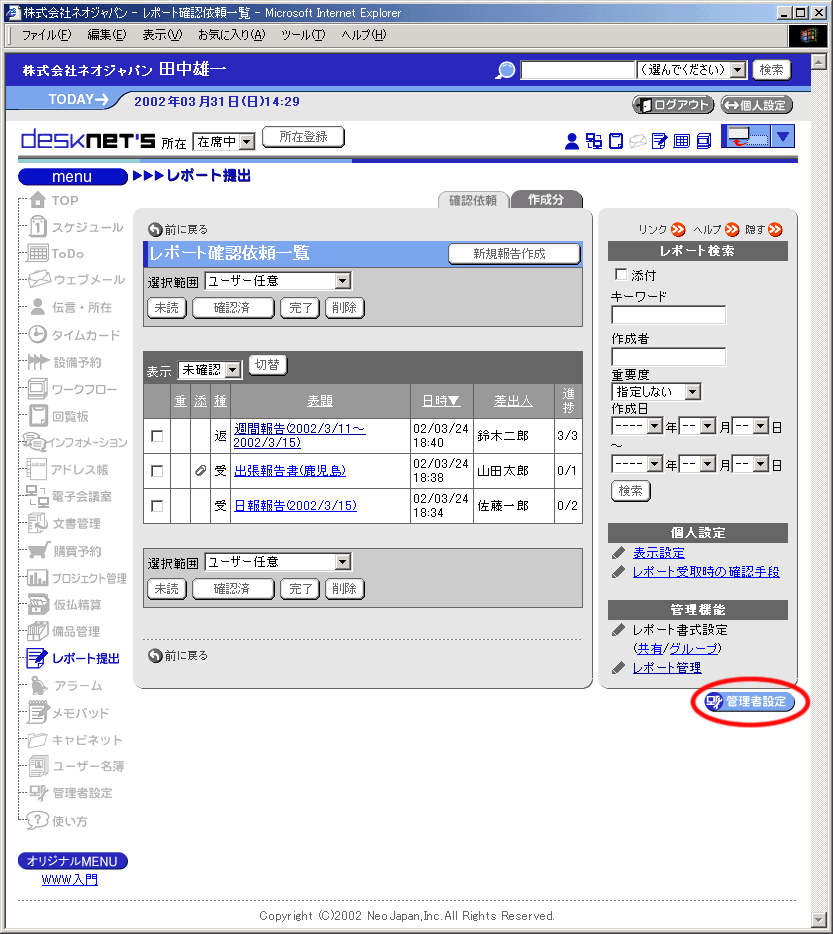 レポート提出画面の右下にある「管理者設定」ボタンを押します。