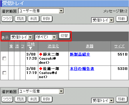 [表示]欄で選択されてる条件に該当するメールが一覧表示されます。
