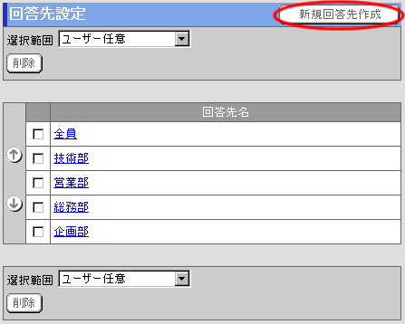 回答先一覧画面の[選択範囲]欄より、削除したい回答先を選択します