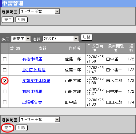 申請管理一覧画面の[選択範囲]欄より、完了したい申請を選択します。