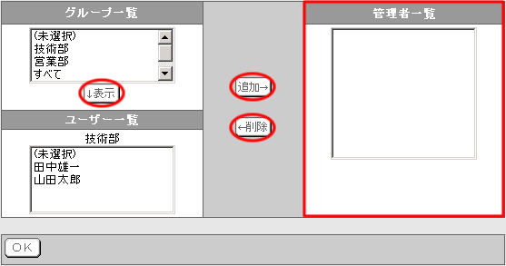 管理者の対象ユーザーを[グループ一覧]、[ユーザー一覧]から選択して[管理者一覧]に設定します。