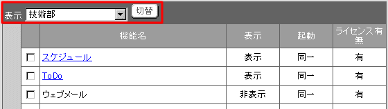 グループ単位でメニューの設定を行いたい場合、一覧上部の”表示”欄から設定したいグループを選択し、グループが使用できるメニュー設定を行います。