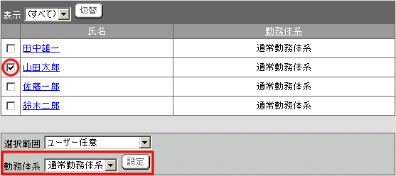 ユーザー勤務体系一覧から、設定を行うユーザーを選択します。