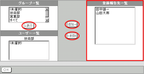 グループ一覧、ユーザー一覧から報告先ユーザーを選択します。