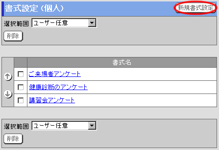 回答書式一覧画面の[選択範囲]欄より、削除したい書式を選択します。