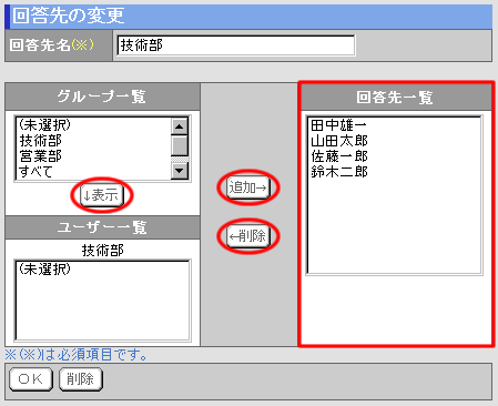 回答先の対象ユーザーを[グループ一覧]、[ユーザー一覧]から選択して[回答先一覧]に設定します。