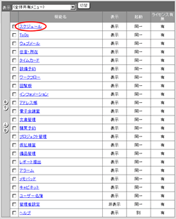 表示欄の「全体共有メニュー」で”非表示”と設定したメニューはグループ単位でのメニュー設定では編集出来ないので機能名はリンクなしで表示されます。