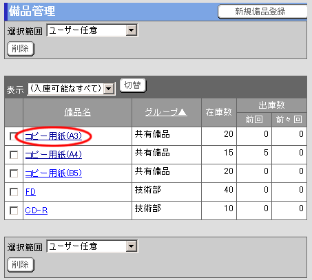 過去に備品が入庫または出庫されている場合、入出庫の履歴が表示されます。