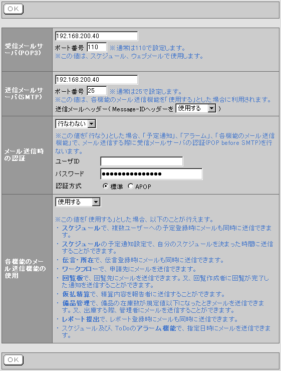 なお、ここでユーザIDが設定された場合、「予定通知」「アラーム」「各機能での通知メール」のメール送信時に受信メールサーバに認証(POP before SMTP)を行います。