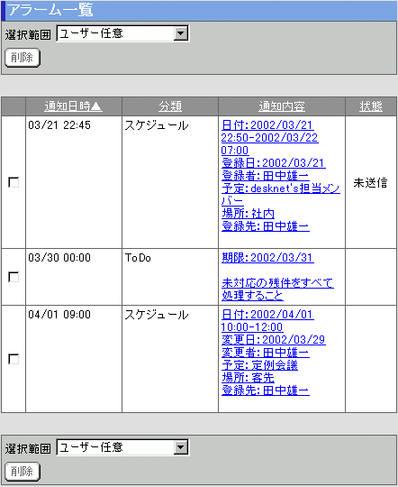 スケジュールの予定や、ToDoの登録や変更で”アラームを送信する”と設定した場合、送信されるアラームの一覧を表示します。