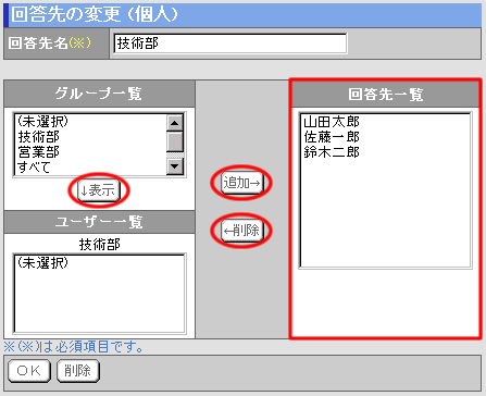 回答先の対象ユーザーを[グループ一覧]、[ユーザー一覧]から選択して[回答先一覧]に設定します。