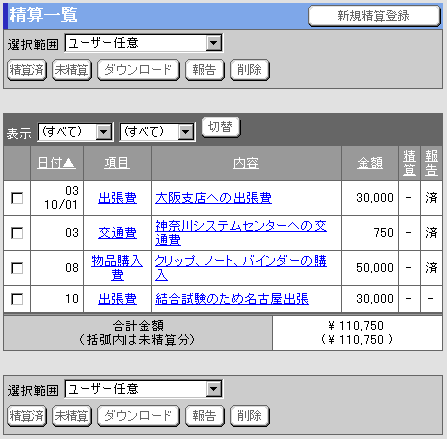 [表示]欄で選択されてる条件に該当する精算内容が一覧表示されます。