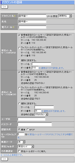 受信メールサーバーを「管理者設定の[メールサーバ設定]で設定された受信メールサーバ(POP3)を使用する。」「ウェブメールのメールサーバ設定で設定された受信メールサーバ(POP3)を使用する。」「個別に設定する。」から選択する。