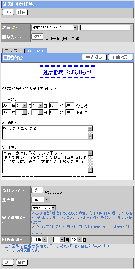 回覧参照画面の「添付ファイル」項目の下にある[複写して新規作成]ボタンを押すと回覧内容を写した「新規回覧作成」画面へ遷移します。