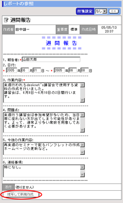 レポート参照画面の「添付ファイル」項目の下にある[複写して新規作成]ボタンを押すとレポート内容を写した「新規レポート作成」画面へ遷移します。