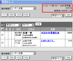 ユーザーに容量設定がされている場合、受信ボックス・フォルダ等に現在の合計使用量、使用率が一覧上部に表示されるようになりました。