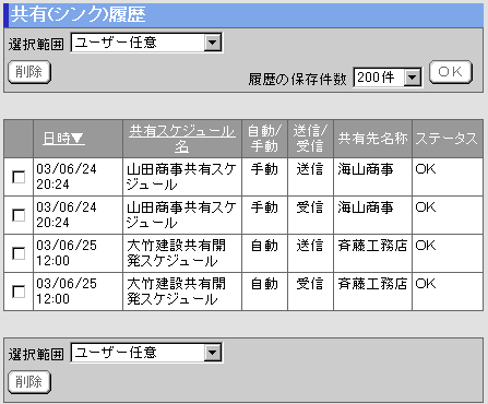 企業間スケジュールシンクの履歴を参照・削除できます。