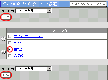 インフォメーショングループ一覧画面の[選択範囲]欄より、削除したいインフォメーショングループを選択します。