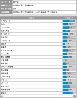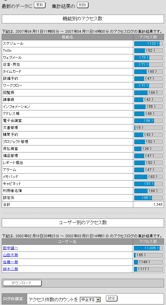アクセス数の集計結果が機能別、ユーザー別に表示されます。